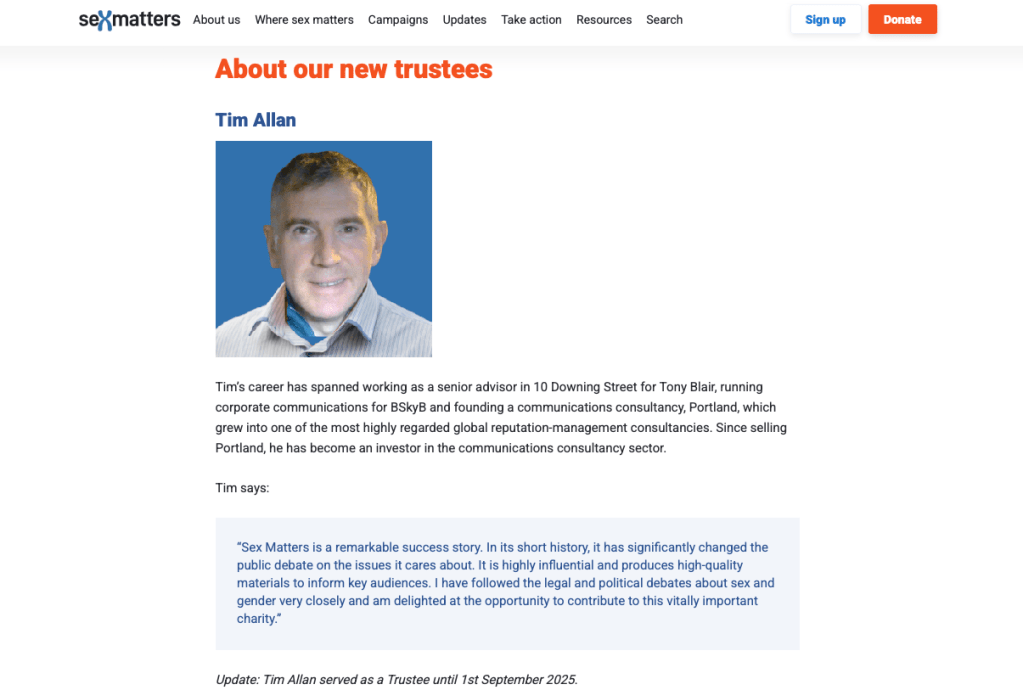Allan, who previously worked in the Tony Blair Labour government, was appointed to oversea the governments internal and external communications strategies. But up until the very morning of his appointment, Allan had been sat on the board of the anti-trans group Sex Matters (see screenshot below).